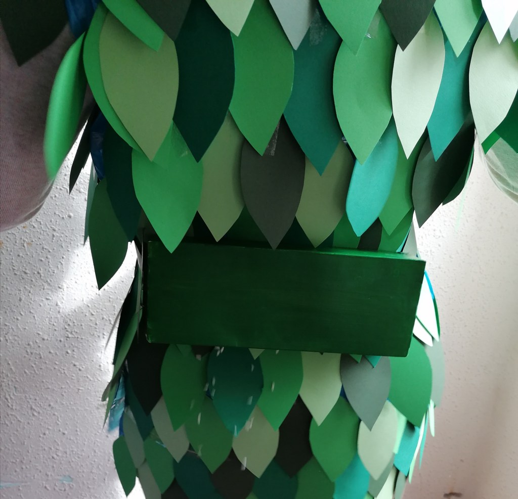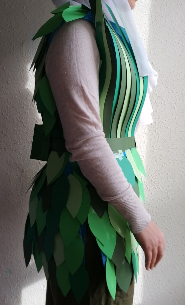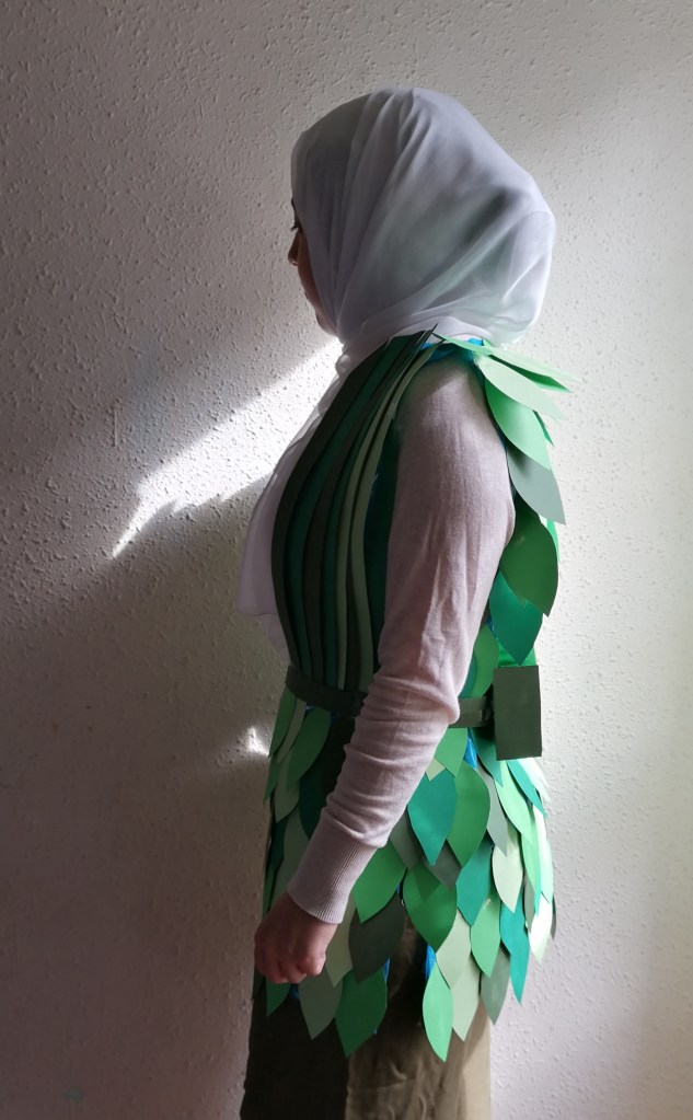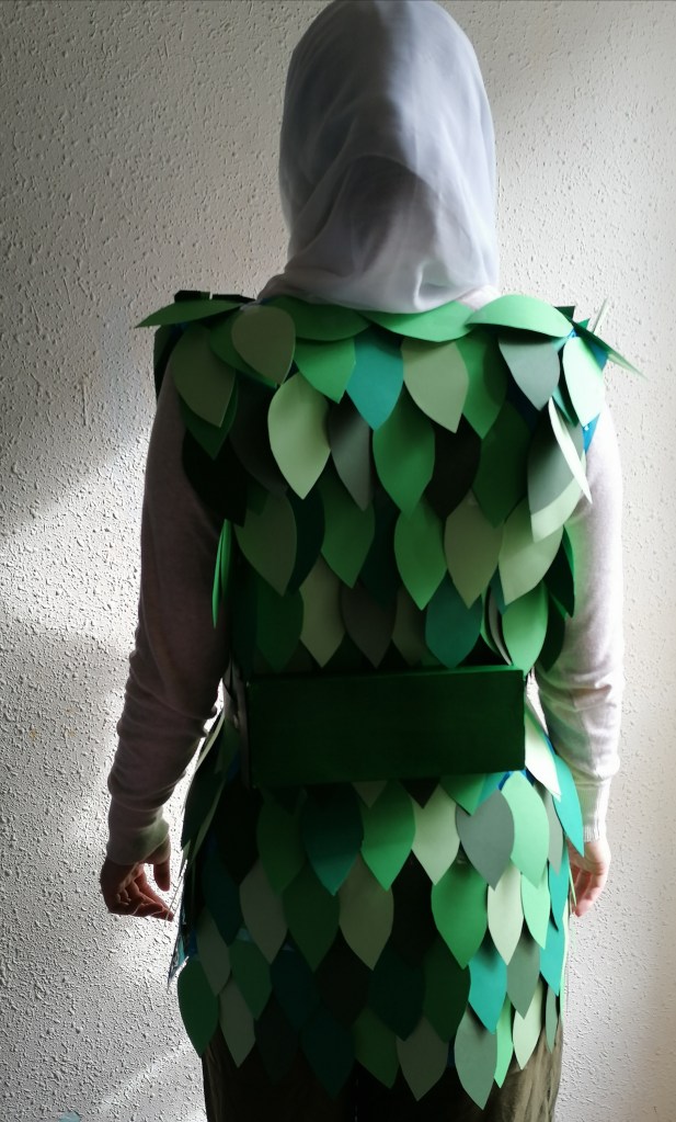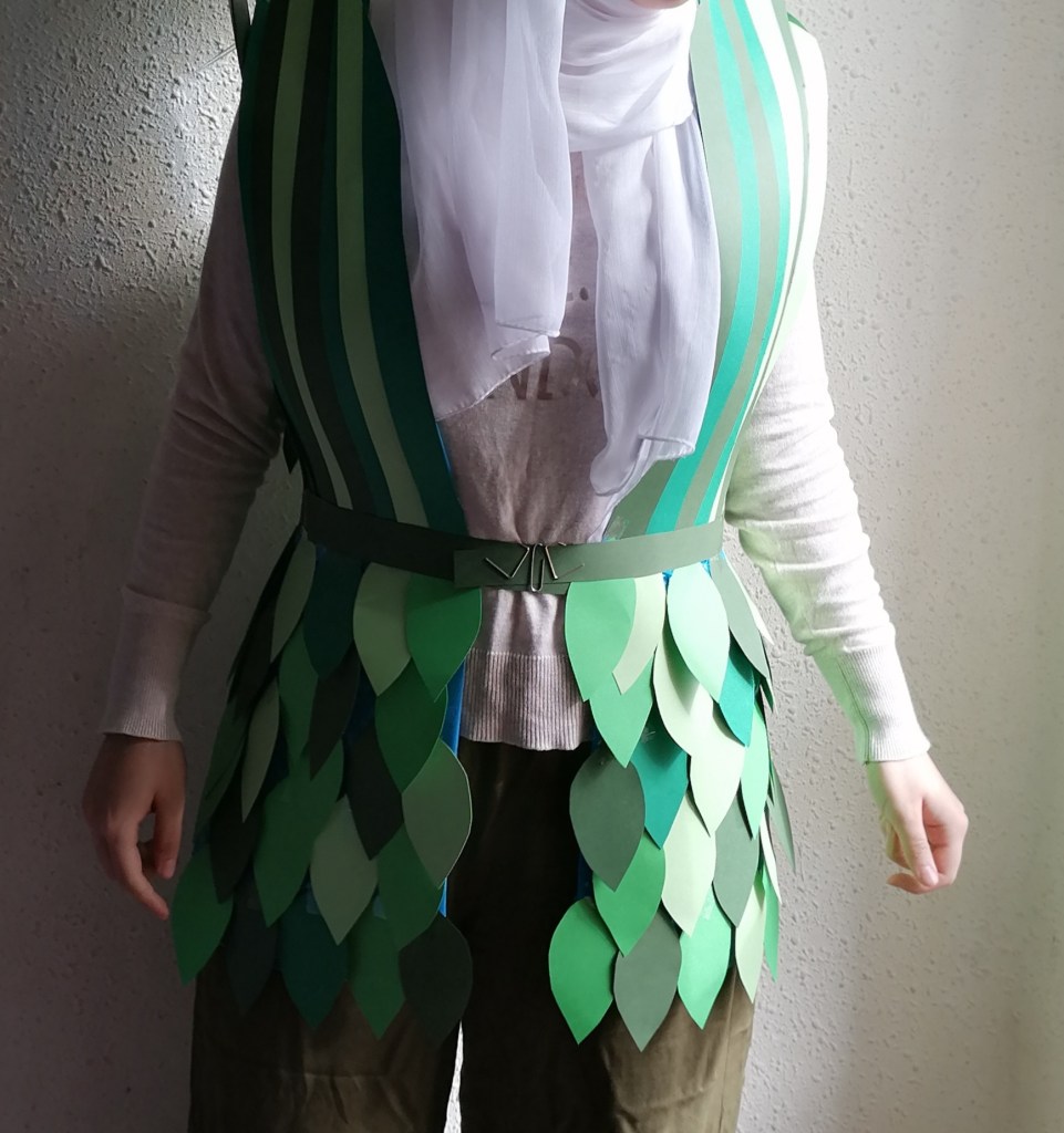 Mi traje consiste en un chaleco con hojas de color verde, tiene un cinturón que sujeta una caja que está el la parte de atrás. Este chaleco es el traje que vestirán las personas que visiten la laguna de la mata en el futuro (dentro de muchos años ) cuando las aves y los humanos consigan convivir juntos. El objetivo de las hojas verdes es que las aves no se molesten por la presencia de los humanos, ya que se confundirán con la vegetación. El cinturón del traje sujeta una caja que lleva unos agujeros en la parte inferior, dentro de la caja se pondrán alimentos de las aves como insectos y semillas, cuándo los visitantes paseen por la laguna esos alimentos se irán esparciendo por el suelo, de esta forma las aves se podrán alimentar y a parte de las semillas que queden saldrán plantas que harán de la laguna un lugar más verde